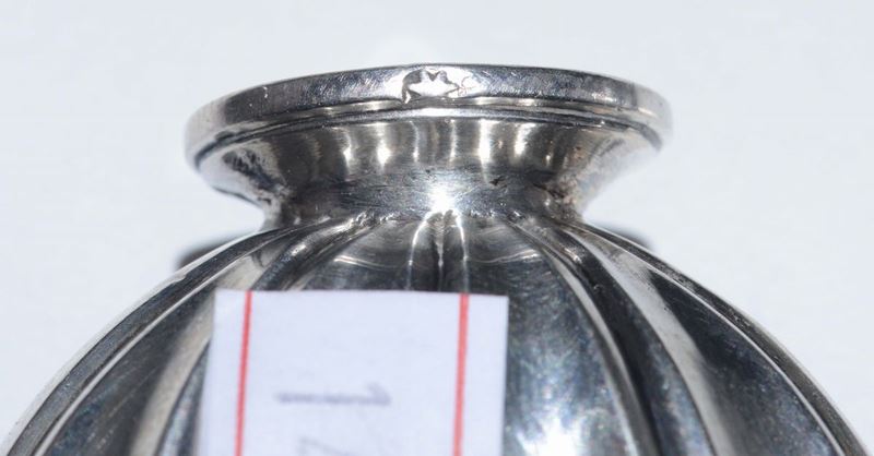 Flacone porta profumo in argento con corpo a forma di vaso sagomato e costolato. Malta XVIII secolo