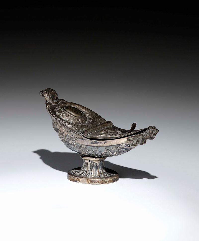 Navicella in argento sbalzato e cesellato. Napoli seconda metà del XIX secolo. Argentiere FP