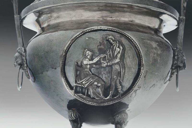 manico in osso e base in legno ebanizzatoL’elegante scaldino esce da una delle più celebri botteghe di orafi e argentieri romani, quella dei Belli, attiva dal XVIII secolo.L’oggetto, con le sue forme stilistiche pulite ed armoniche composte di linee sferiche e circolari, arricchite di elementi zoomorfi classicheggianti come le teste di leone e le zampe ferine, aderisce in pieno ai modelli interpretativi del gusto neoclassico che caratterizzarono la fortunata produzione di questa bottega a cavallo tra il Settecento e l’Ottocento, testimoniata dai numerosi disegni preparatori di Gioacchino Belli (1787-1822) e Pietro Belli (1825-1828), rispettivamente nonno e padre dell’esecutore del manufatto qui presentato.Da apprezzare il divertente medaglione centrale che mostra un giovane uomo che porge ad una giovane donna seduta, vestiti entrambi in abiti ottocenteschi, uno scaldino simile al nostro, testimonianza di una vivida rappresentazione di vita quotidiana che caratterizzava la cultura romana di quel tempo, con figure come quelle dell’incisore Bartolomeo Pinelli e il poeta Gioacchino Belli.Altezza cm 25.