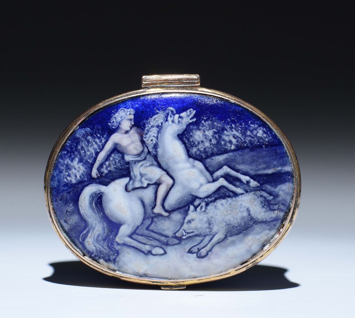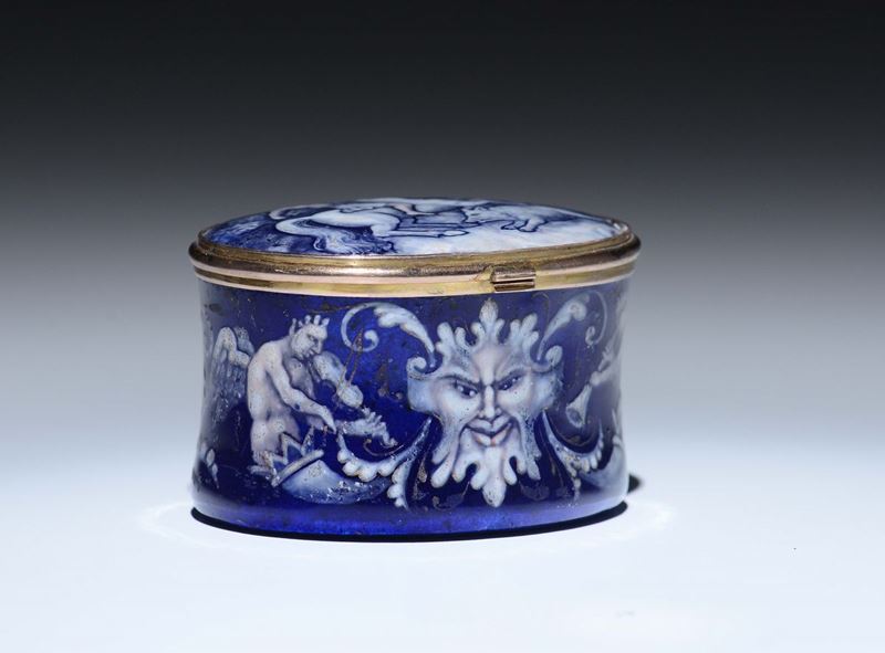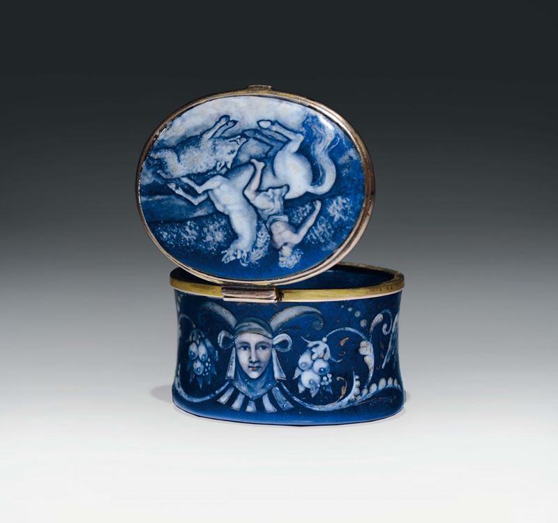 decorazioni in grisaille su fondo blu raffiguranti figure fantastiche e mascheroni sulla fascia e caccia del cinghiale sul coperchio. Cm 6,2x3,8