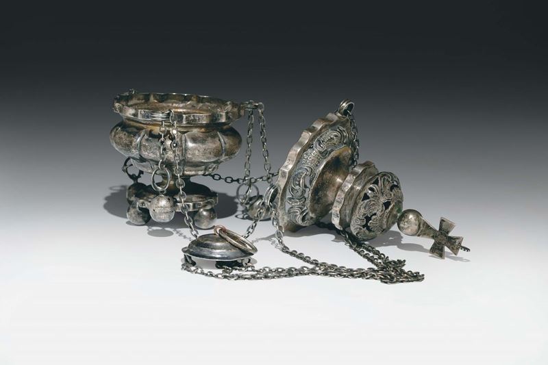 Turibolo in argento fuso, sbalzato e cesellato. Europa centrale XIX secolo