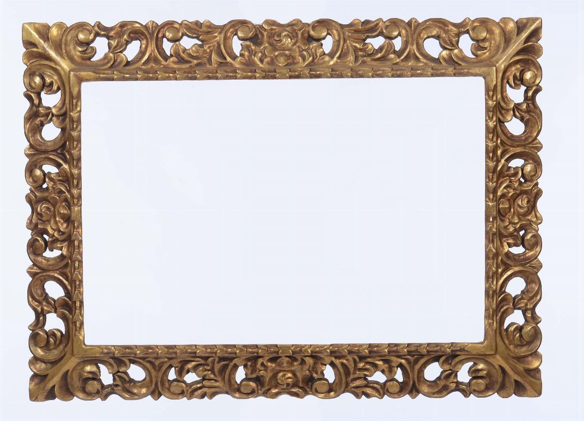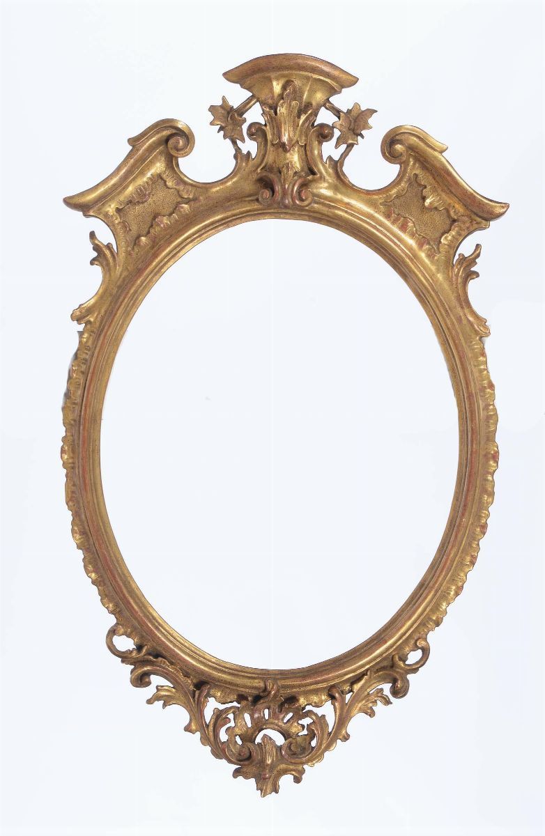 Cornice ovale dorata con cimasa a volute e cornice traforata e dorata, XIX-XX secolo