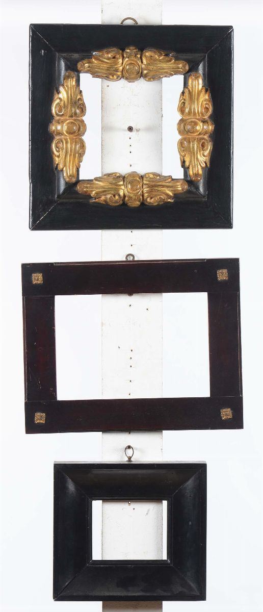 Gruppo di cinque cornicette ebanizzate e dorate, XX secolo