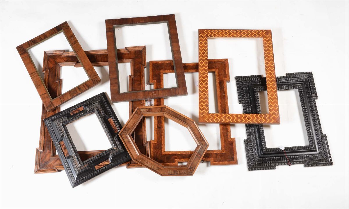 Gruppo di sei cornici in legno lastronato e filettato, XX secolo