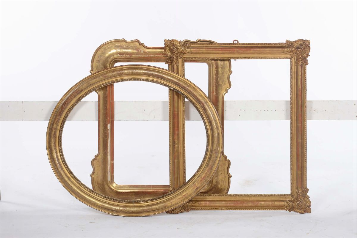 di cui una ovale, una con angoli stondati e cimasa, una con teste di leone agli angoli e una a vassoio , cm 74x87 (63x76), cm 102x72 (74x56,5), cm 86x73 (70,5x55,5), cm 78x63 (65x50,5)