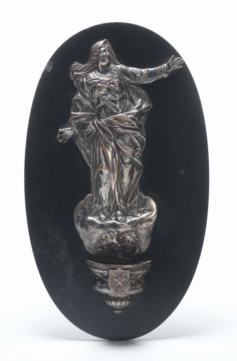 Acquasantiera in metallo argentato e sbalzato, XIX secolo