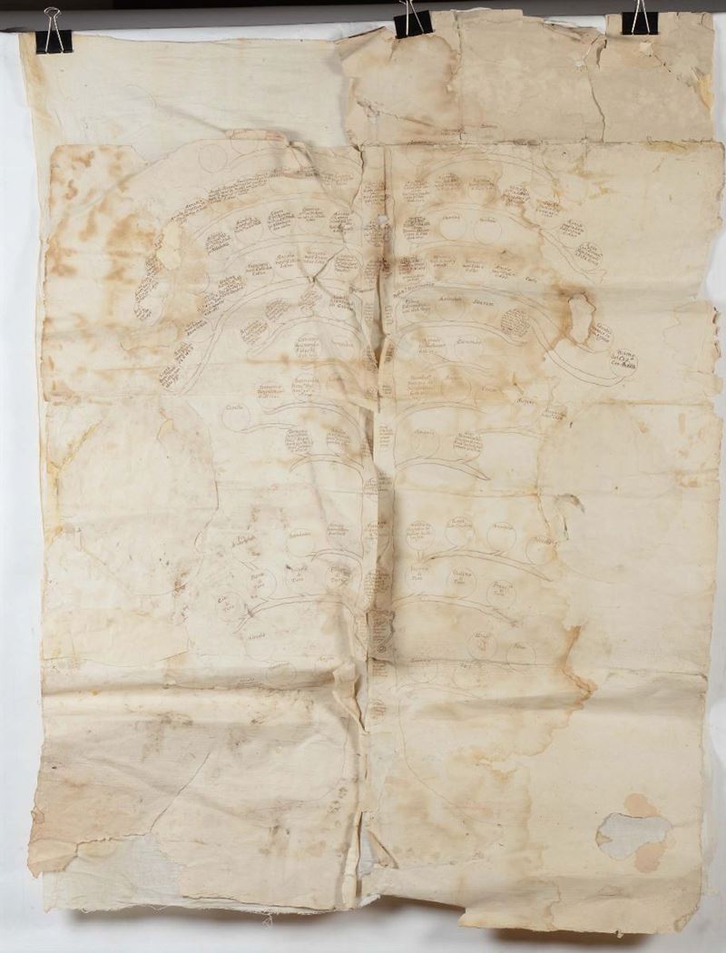 cm 52x47, nel lotto altro albero genealogico su carta, cm 126x90 (danni e difetti)