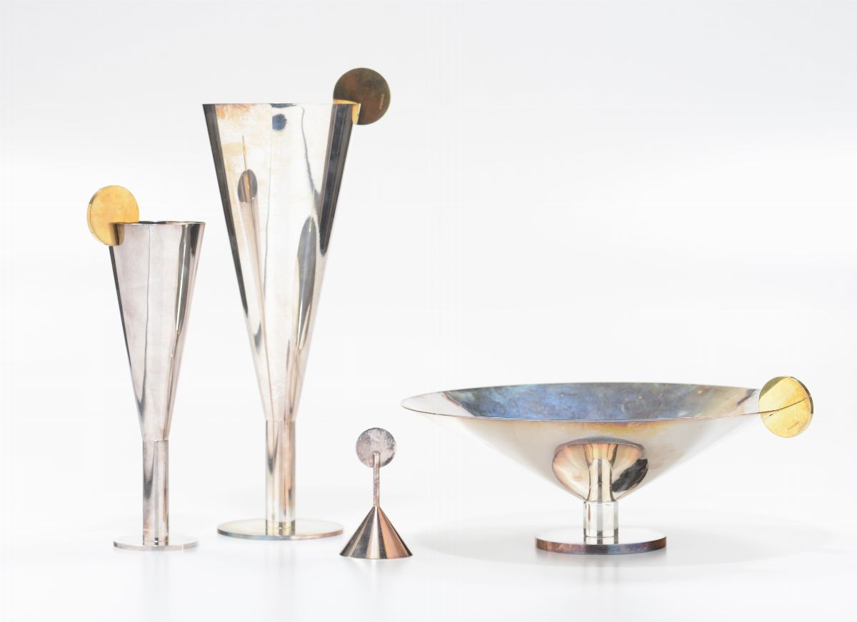 Lotto comprendente quattro oggetti in silver plate. Marchi della manifattura e del designer sul fondo. Altezze cm 36, cm 27, cm 9, diametro cm 30