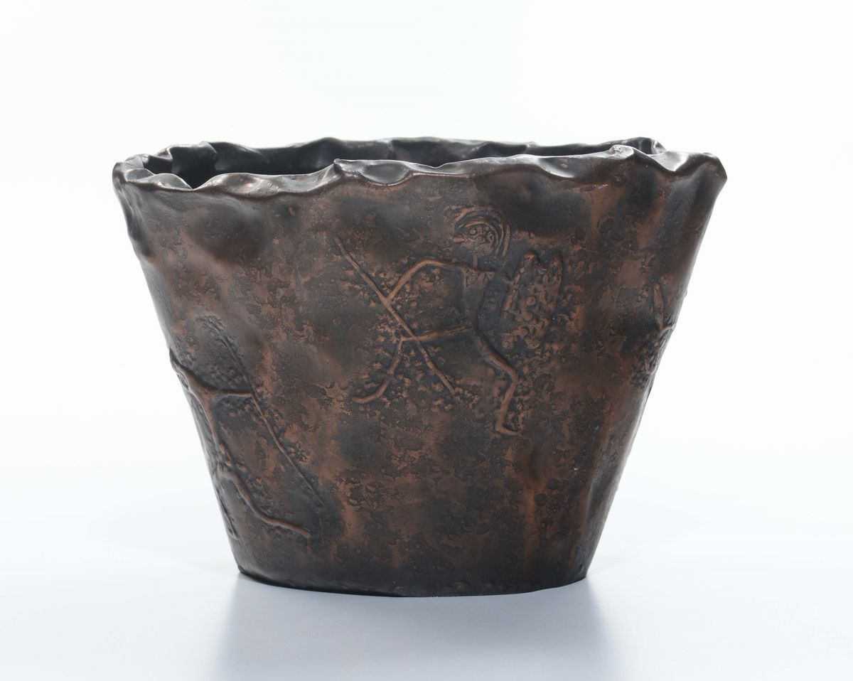 Portavasi in rame sbalzato con figure stilizzate. Sotto la base incusso Bragalini 1958. Altezza cm 18
