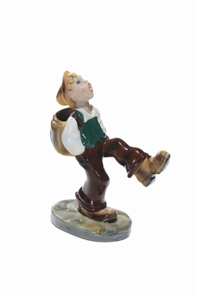 Terracotta maiolicata modellata a colaggio e dipinta in policromia sotto vernice, raffigurante giovanetto con zaino in spalla. Sotto la base firma della manifattura e titolo. Altezza cm 31,5