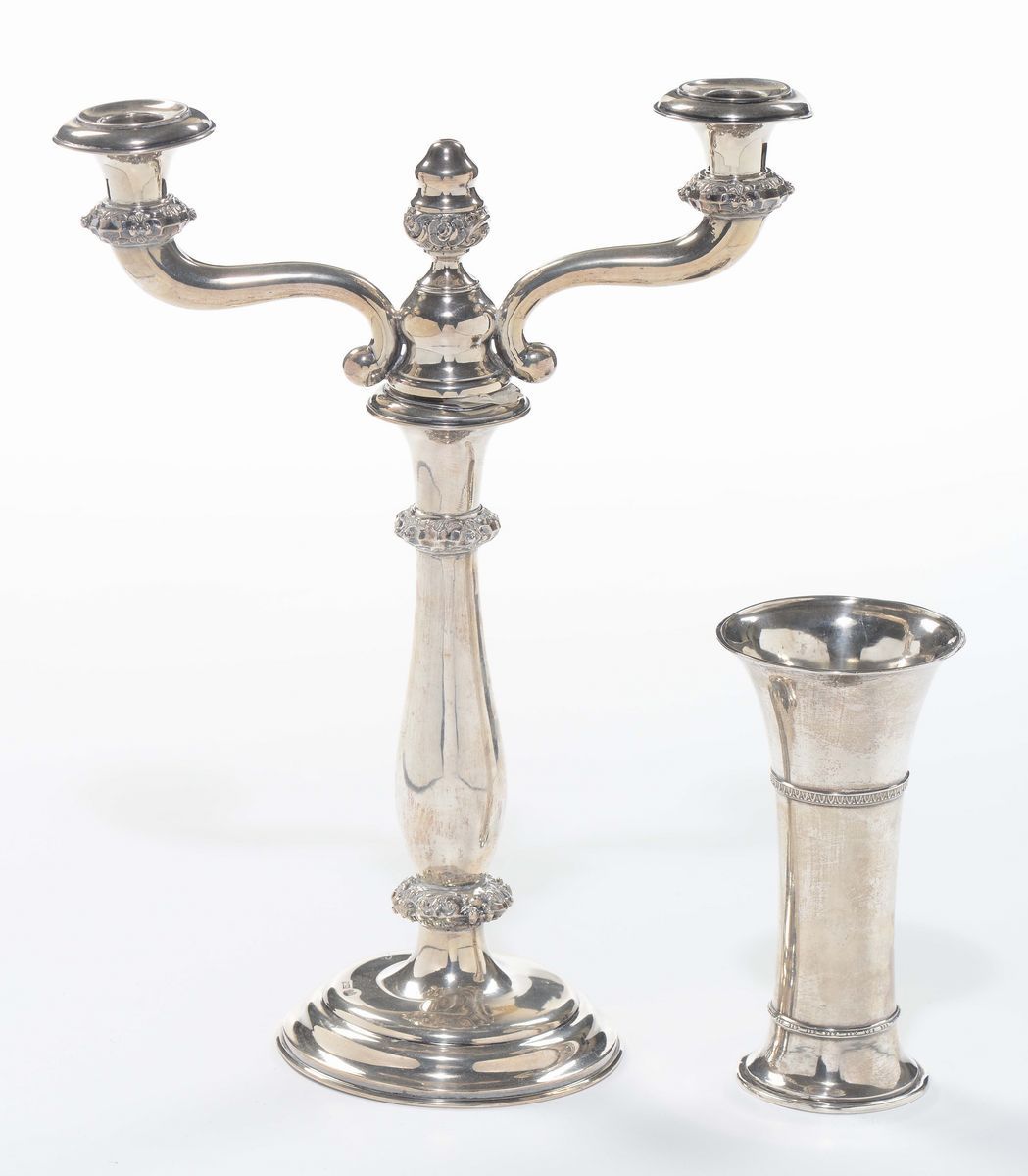 Candeliere a tre fiamme austroungarico e bicchiere in metallo argentato
