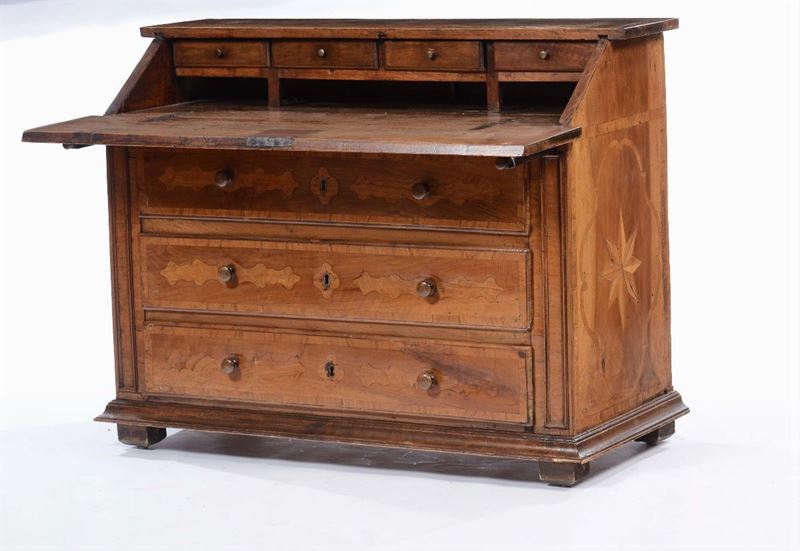 Cassettone a ribalta lastronato, intarsiato e filettato, Piemonte XVIII secolo