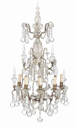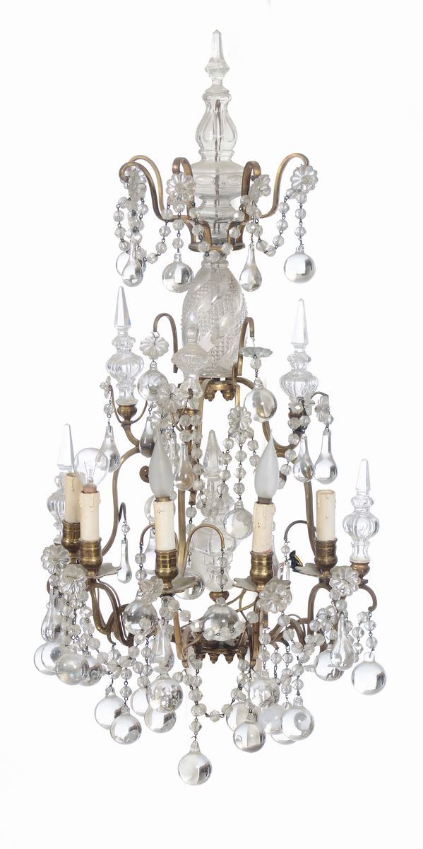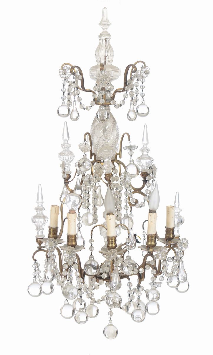 Coppia di appliques a cinque luci in metallo dorato e cristalli, XIX secolo