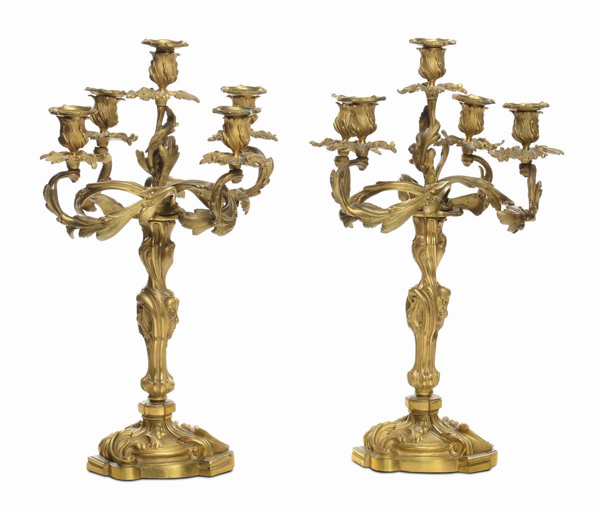 Coppia di candelieri in bronzo dorato a cinque bracci, XVIII-XIX secolo