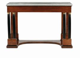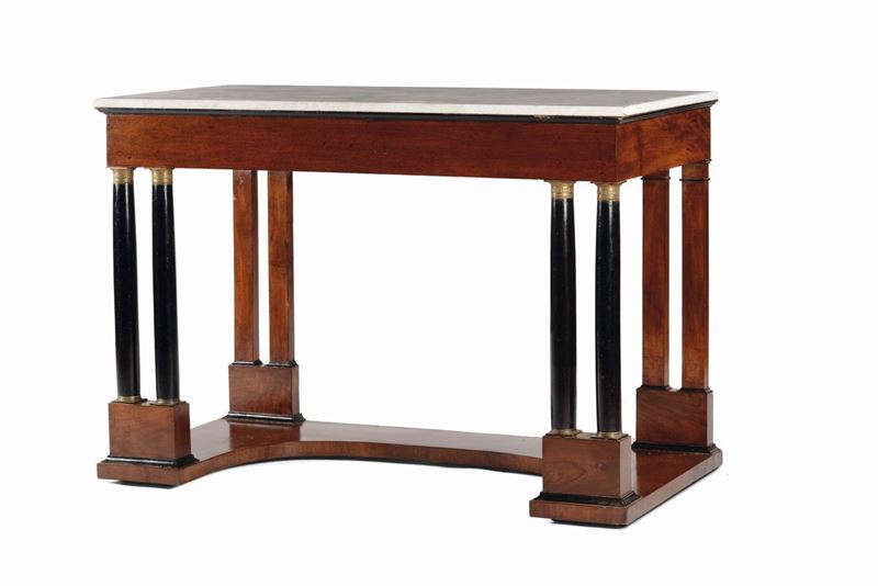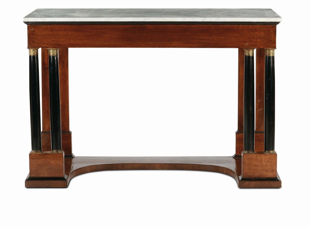 montanti a doppia colonna ebanizzata, piano in marmo bianco, cm 142x68x93