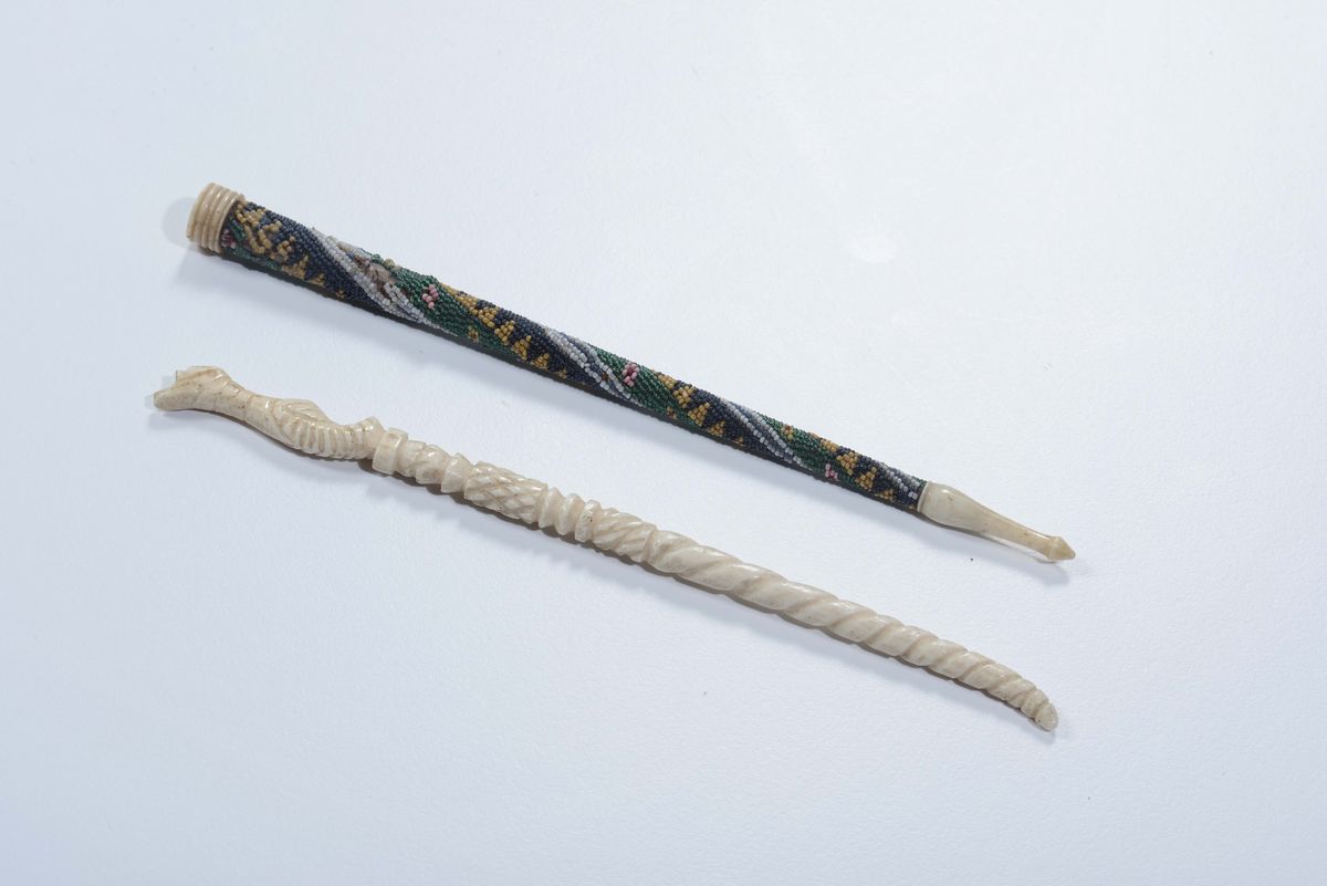 Coppia di porta aghi in avorio inciso e perline colorate
