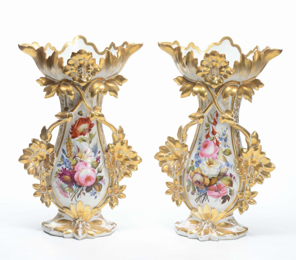 Coppia di vasi in porcellana bianca dorata e dipinta in policromia, XIX-XX secolo