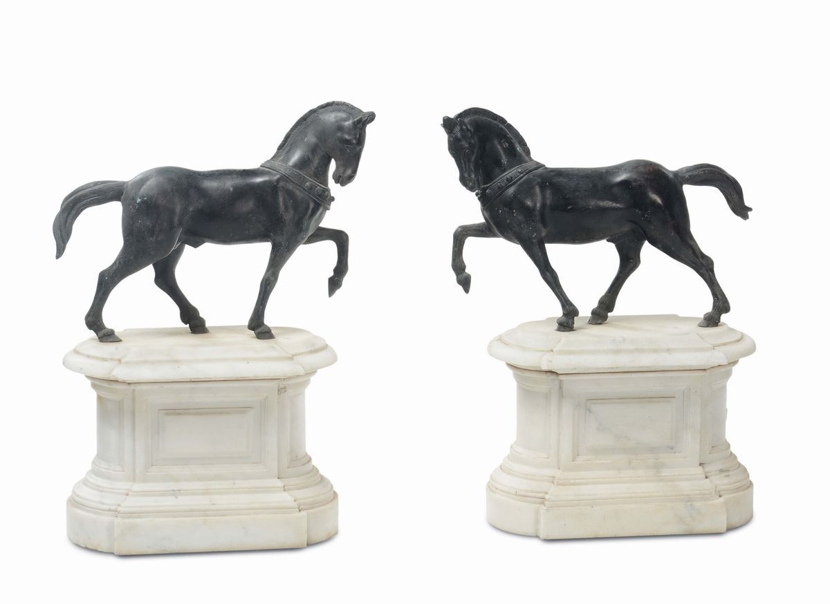 Due cavalli in bronzo brunito su basi in marmo bianco, XX secolo