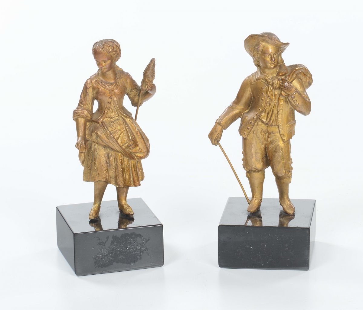 Due sculture in bronzo dorato raffiguranti figure, XX secolo