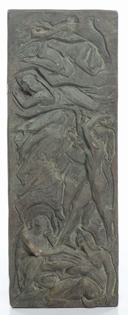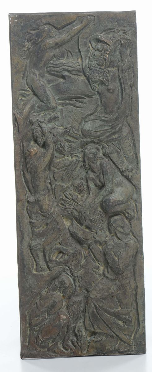 Due bassorilievi in bronzo, cm 60x20, firmati e datati 1962