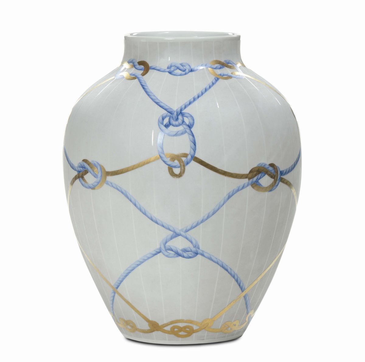 Vaso in porcellana decorato con nodi marinari in azzurro e oro. Marchio della manifattura in cartiglio dorato.Altezza cm 30. 1940 circa