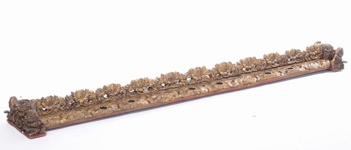ricchi decori intagliati a motivo floreale e vegetale, cm 250x30x20