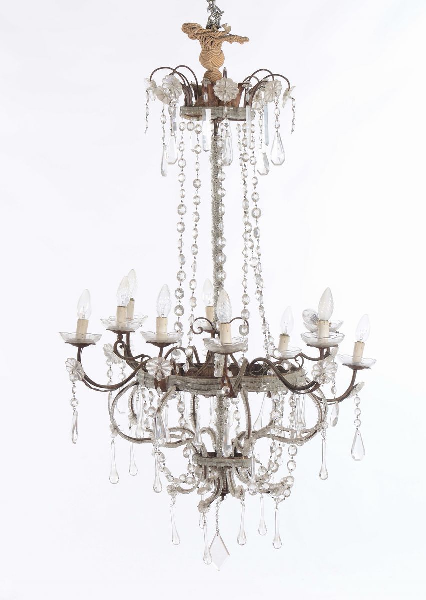 Lampadario a dieci luci in metallo e cristalli