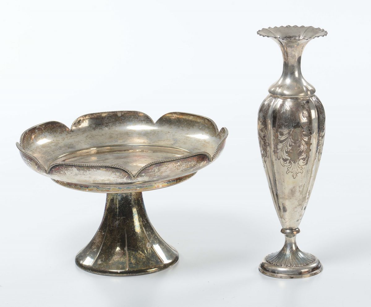 Lotto composto da alzata in metallo e portafiori in argento