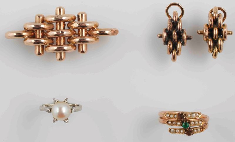 Lotto composto da due anelli, una spilla ed un paio di orecchini