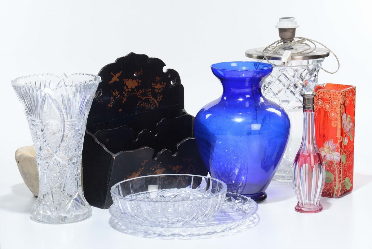 Lotto di oggetti in cristallo e portariviste ebanizzato