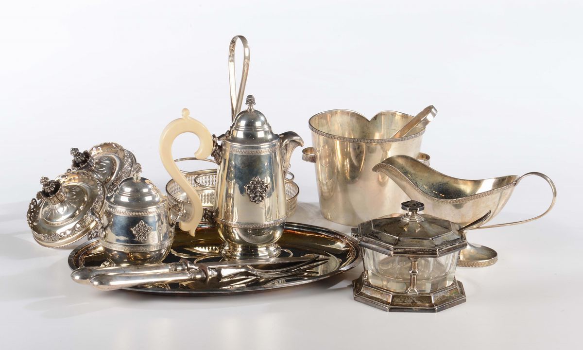tra cui vassoio, oliera senza ampolle, secchiello da ghiaccio, zuccheriera, salsiera, formaggiera, caffettiera e due posate di servizio.Gr. 2700