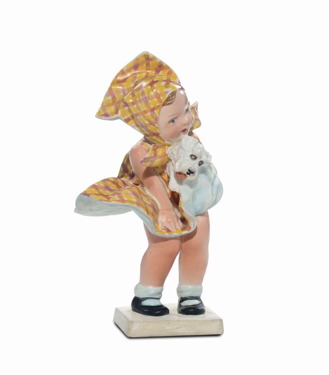 Statuina in terracotta maiolicata modellata a colaggio decorata in policromia. Firma incussa. Altezza cm 24