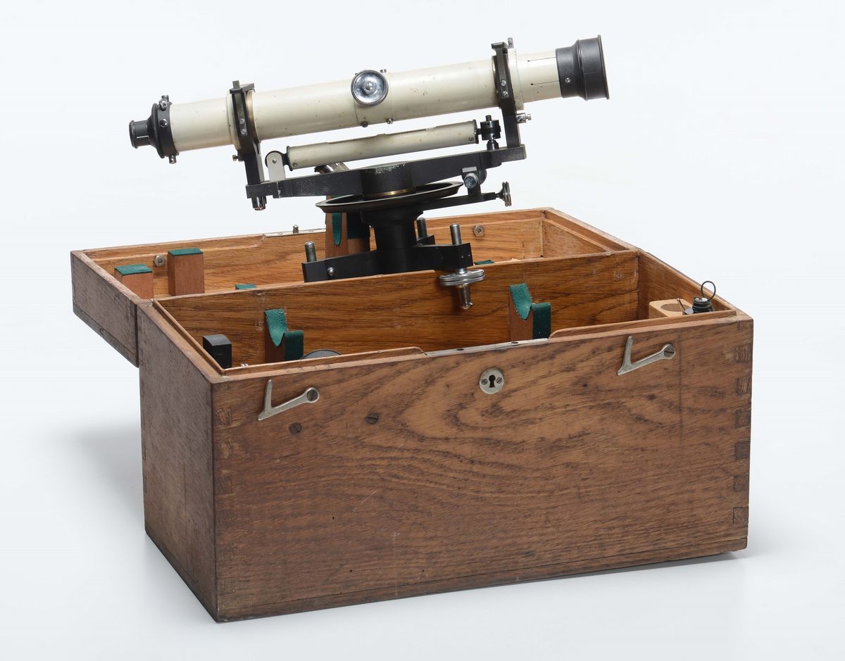 Microscopio da tavolo in custodia originale in legno, 1930 circa