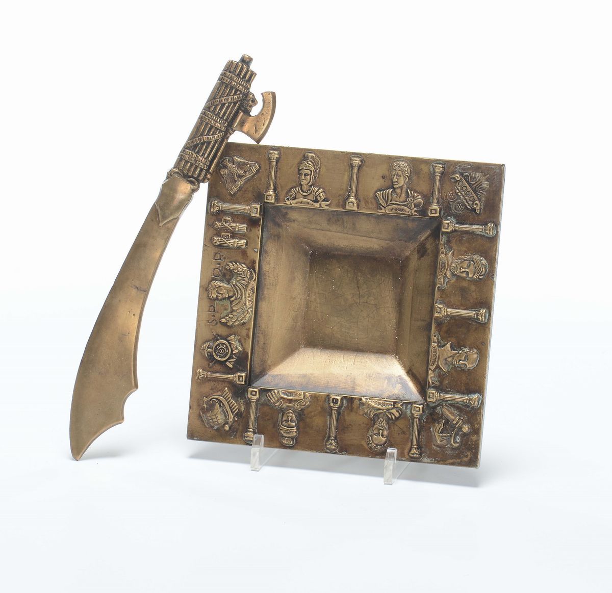 Posacenere e tagliacarte in metallo dorato con simboli del fascio