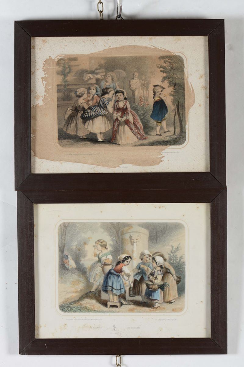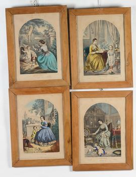 Quattro stampe inglesi colorate con cornici in legno messello più due diverse