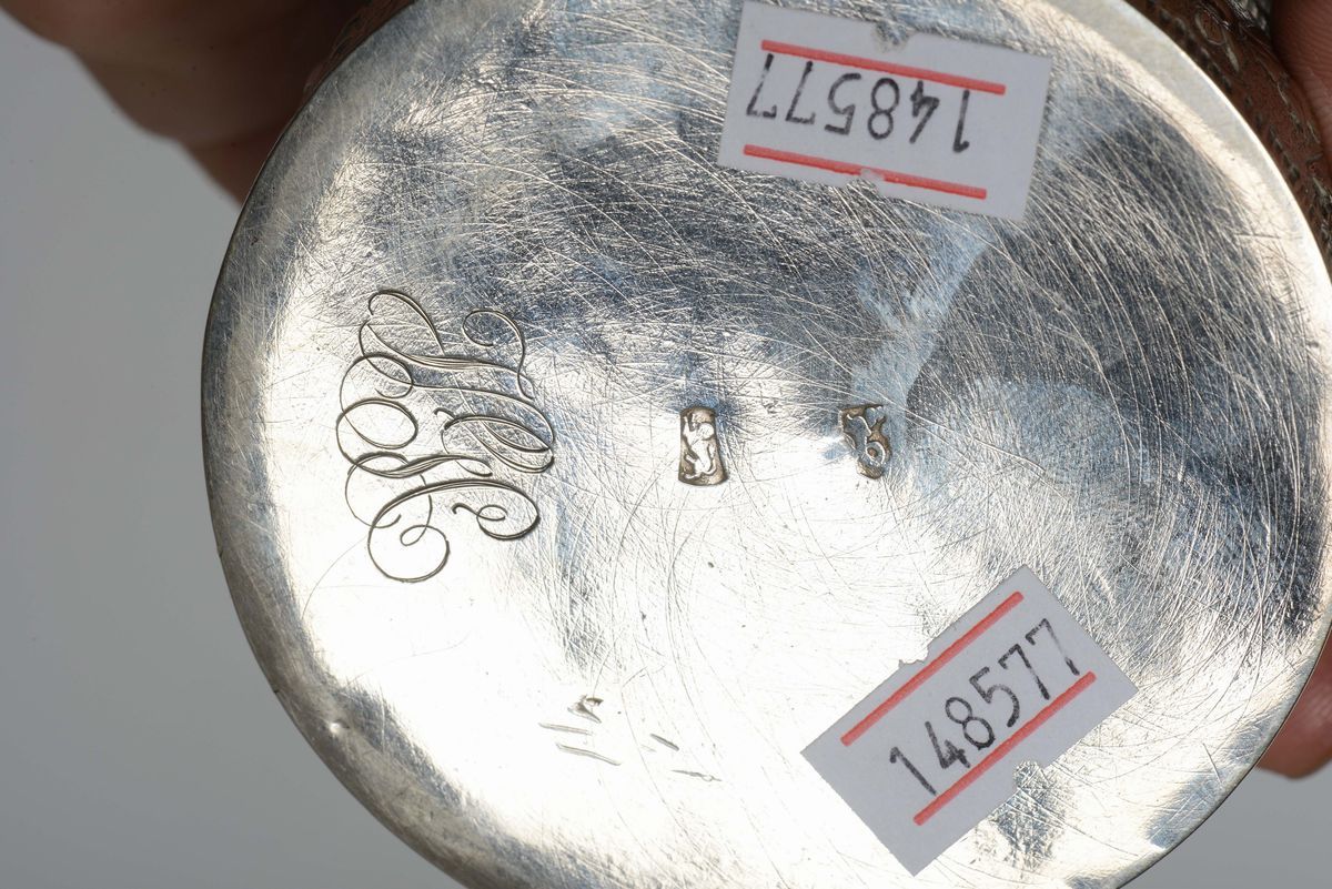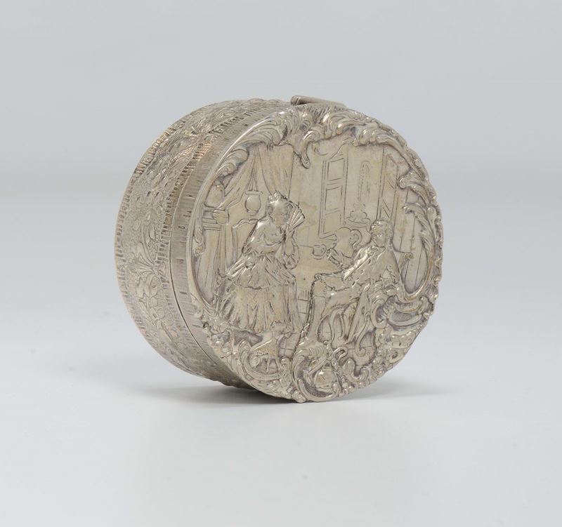 Scatolina circolare in argento sbalzato, Inghilterra XX secolo
