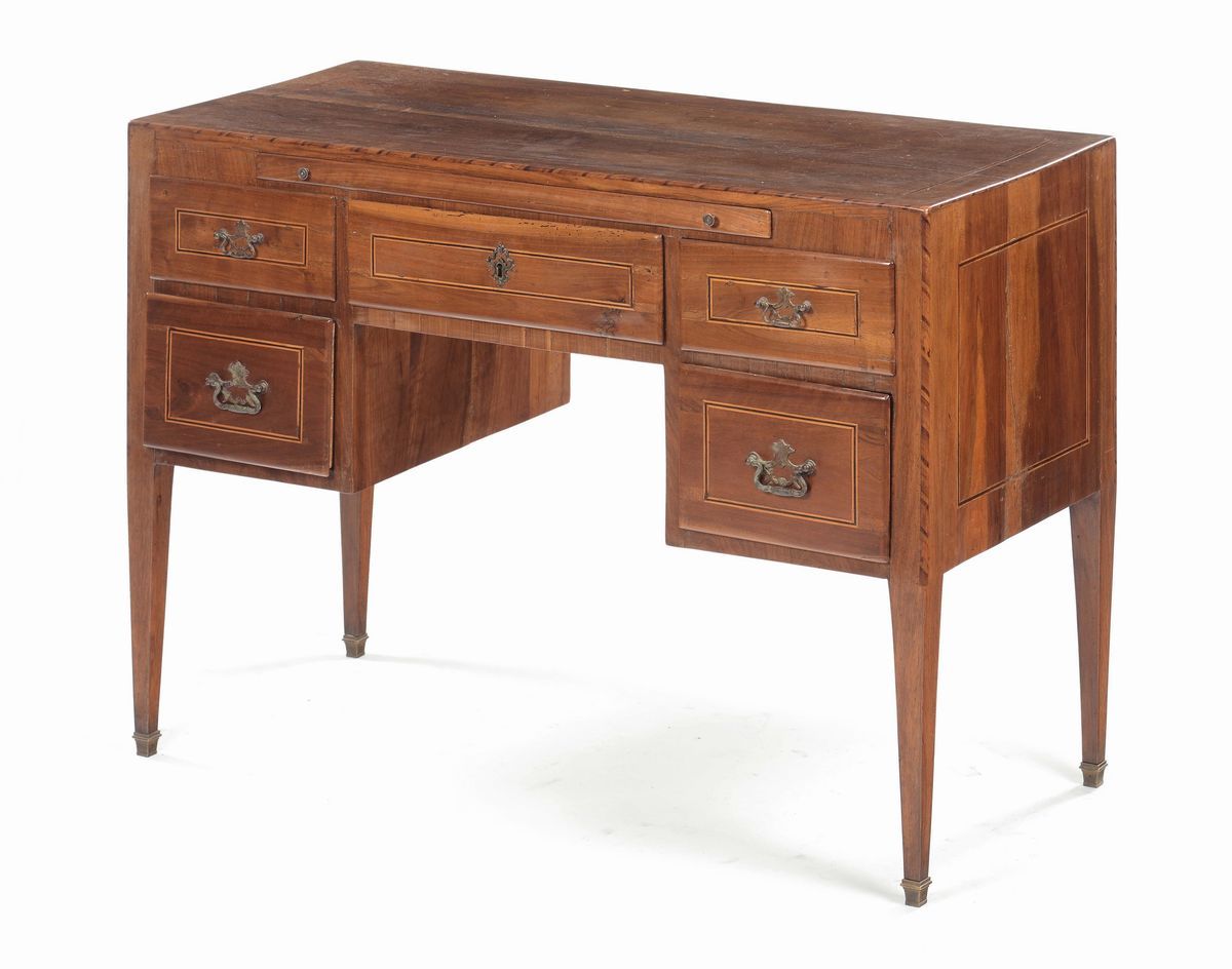Scrivania a cinque cassetti lastronata e filettata, XIX secolo