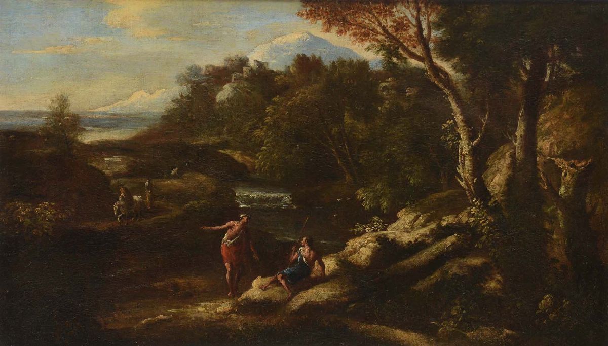 Scuola del XVIII secolo Scena mitologica di figure in riva ad un fiume