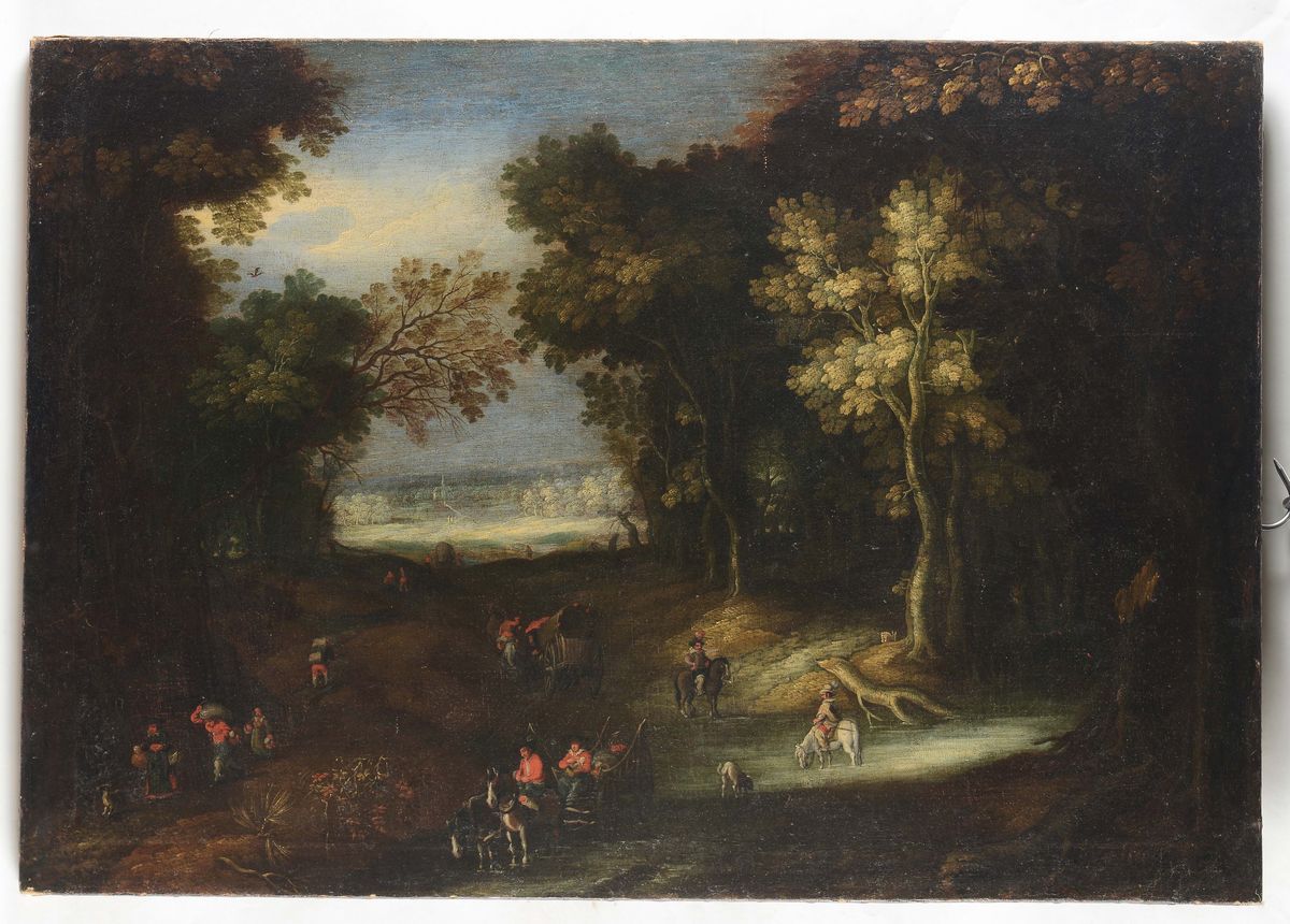 Scuola Fiamminga del XVIII secolo Paesaggio boschivo con personaggi