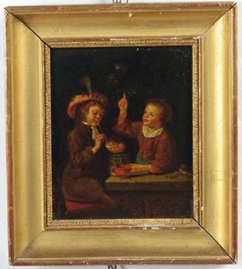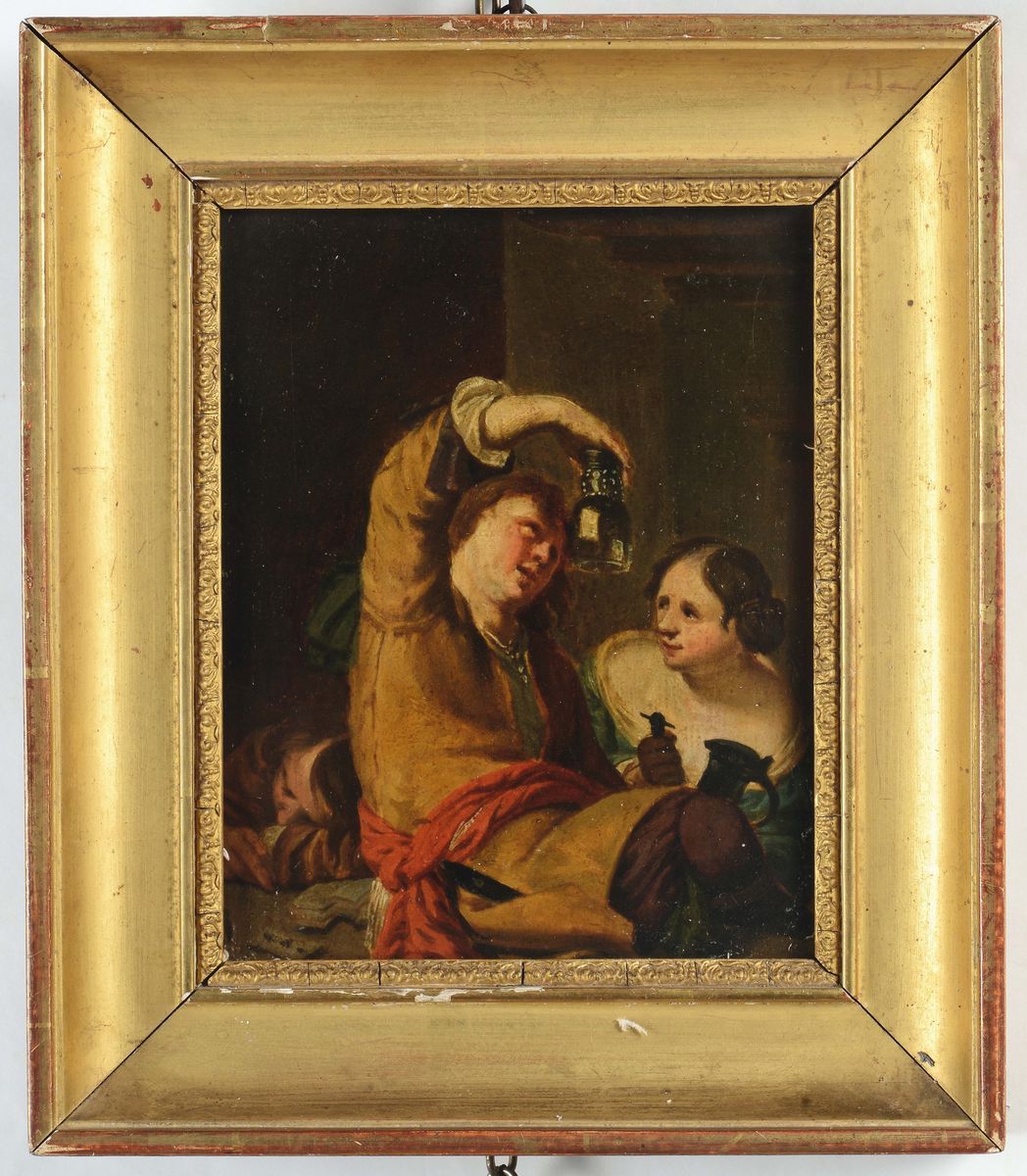 Scuola fiamminga del XVIII secolo Coppia di scene d'interno con figure