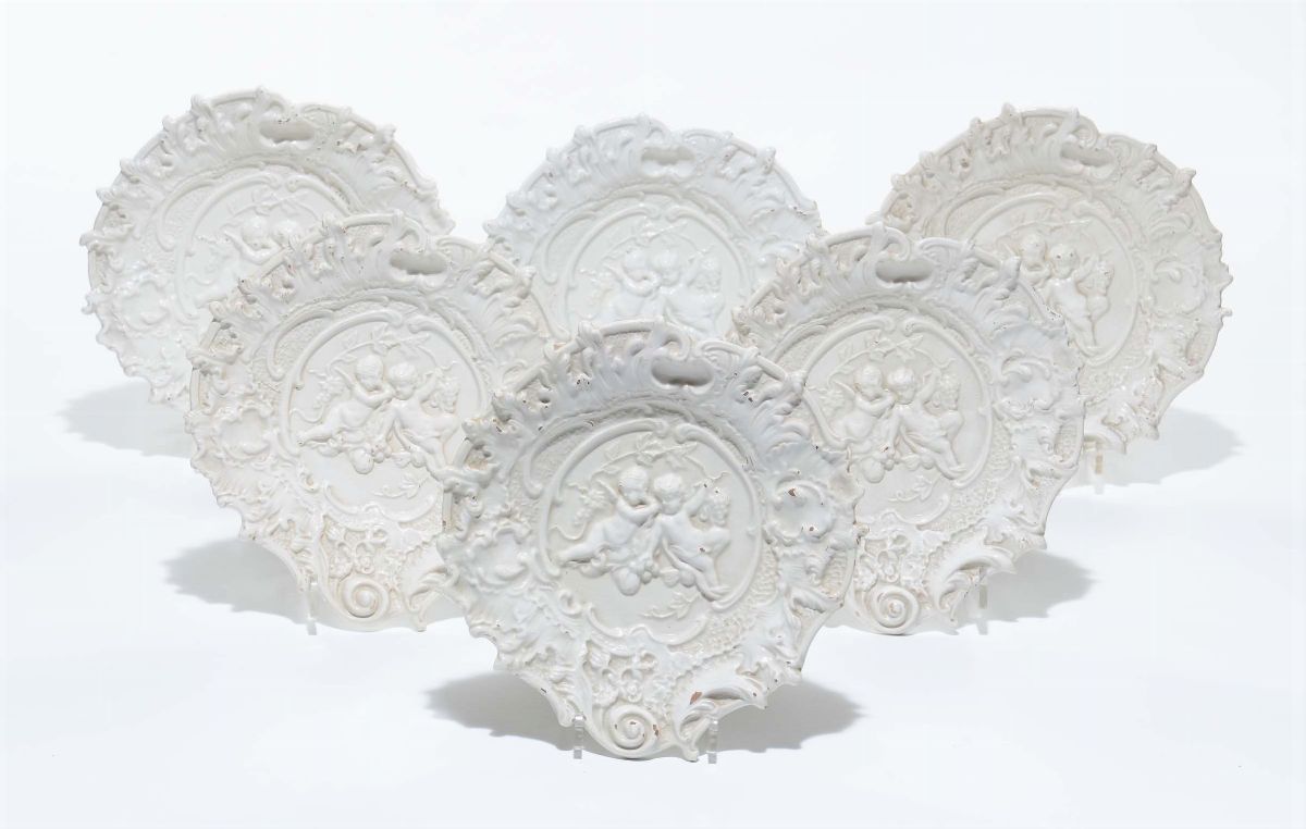 Sei piattini in ceramica bianca con decorazione di puttini a rilievo, XIX secolo