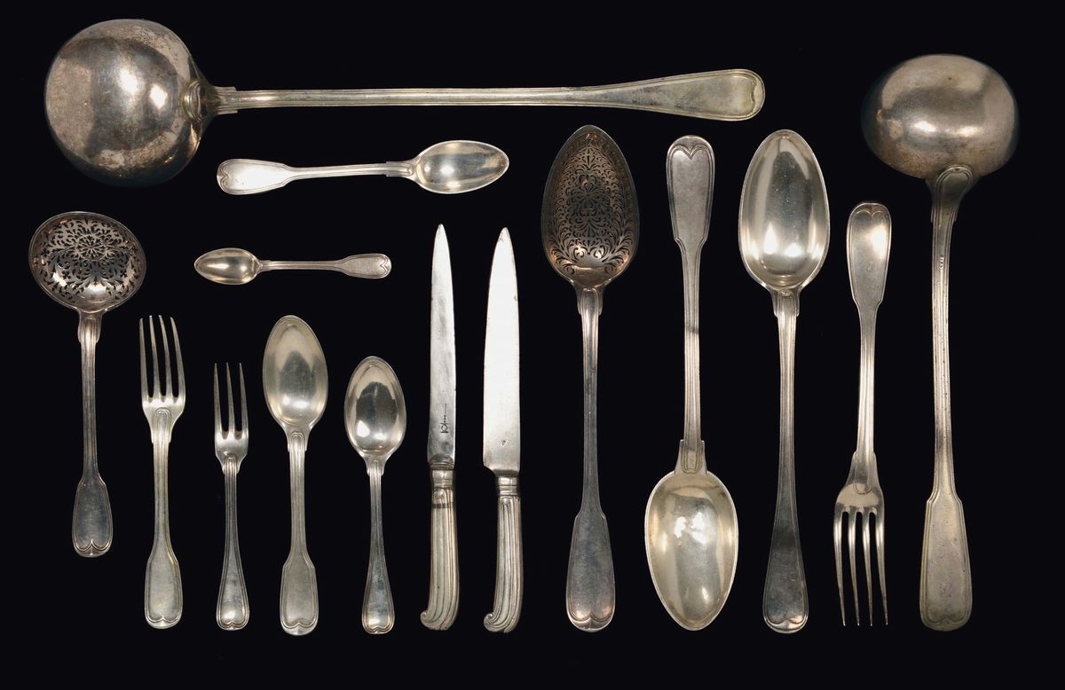 composto da 12 forchette, cucchiai e coltelli grandi, 12 forchette, cucchiai e coltelli medi, 20 forchette piccole, 12 cucchiai piccoli, 10 cucchiai piccoli, 12 cucchiaini e 8 posate da servizio.Gr. 8500 circa
