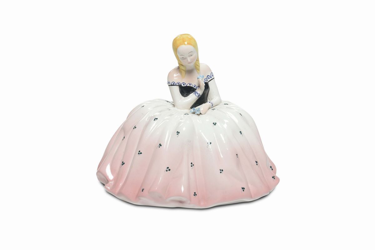 Terracotta maiolicata modellata a colaggio e dipinta in policromia. Sotto la base: simbolo della manifattura, F.S. Tosin. Altezza cm 9, larghezza cm 22