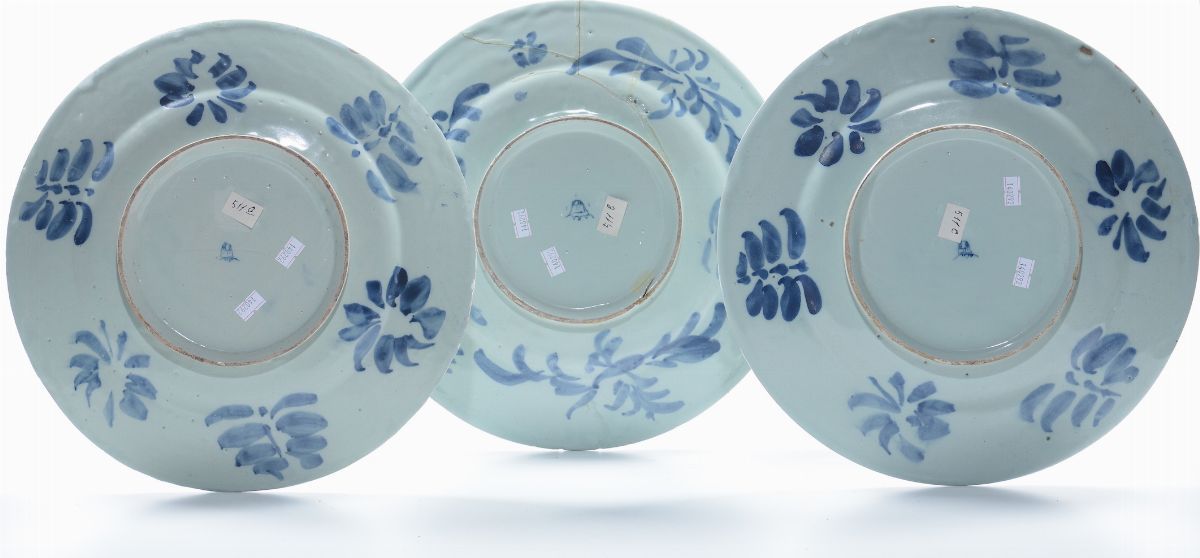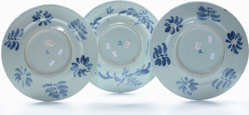 Tre grandi piatti maiolica bianca e blu, Savona marca Reale, XVIII secolo