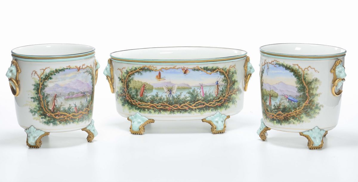 composto da fioriera ovale e coppia di cachepot, altezze cm 19,5 e cm 23