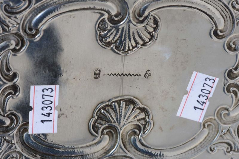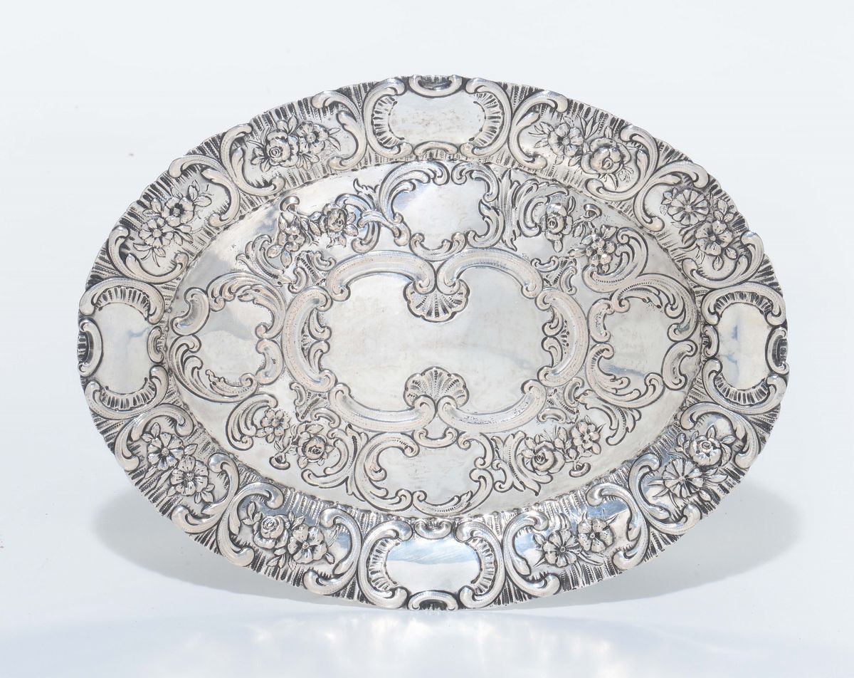 Vassoio ovale in argento sbalzato, XX secolo