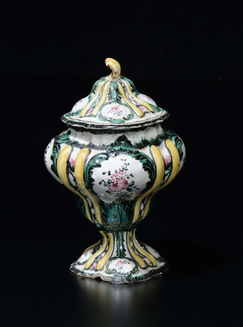 Maiolica a terzo fuoco in policromia, altezza cm 29,5Sbeccature alla bocca al piede, che mostra una piccola lacunaCorpo “a balaustro” costolato, poggiante su alto piede svasato, e base orlata incavata. Bocca polilobata Coperchio “a pagoda” con bordo mistilineo e presa a conchiglia.Decorazione a settori verticali con tralci di roselline singole o raggruppate, entro fasce arricchite da un ornato a foglie stilizzate in verde e nero.