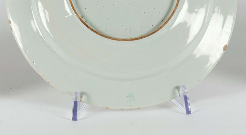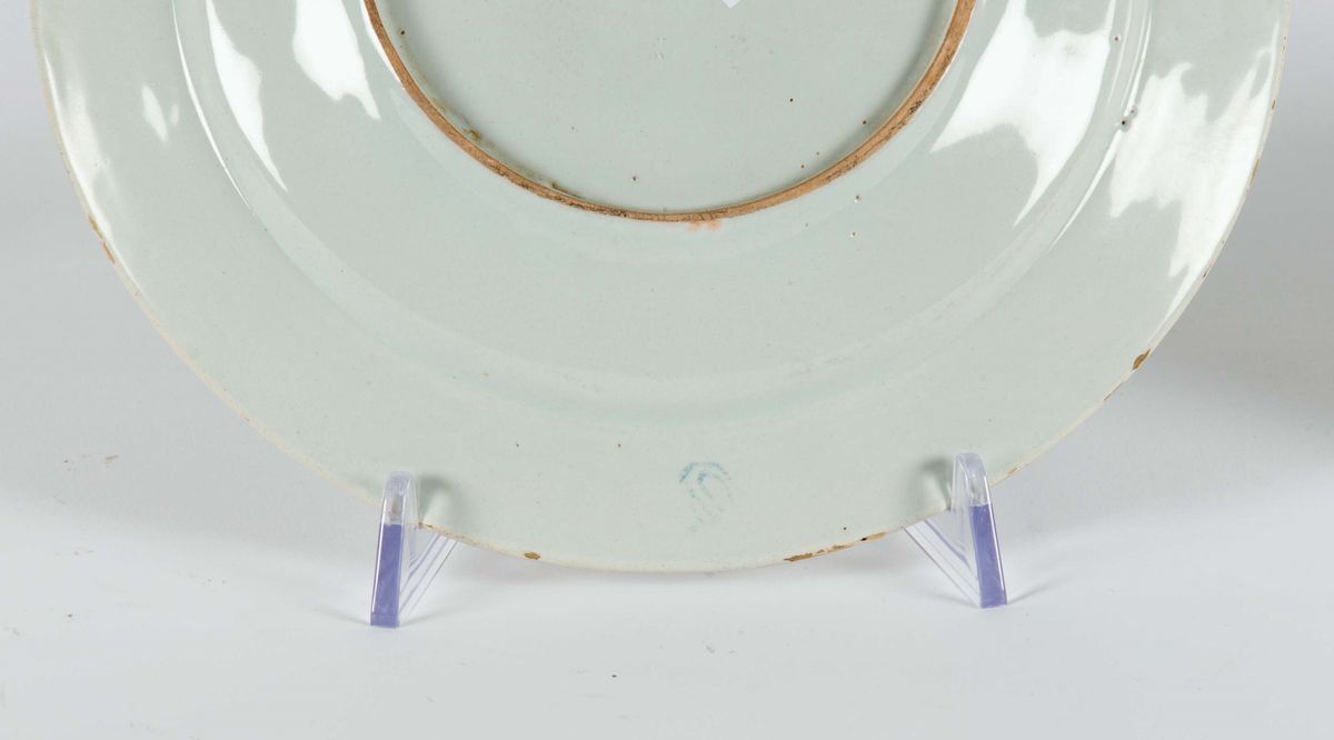 Maiolica a terzo fuoco in policromia con oro, diametro cm 23,0Buono statoCorpo circolare, tesa lievemente rialzata, piede ad anello.Decoro “Imari” (blu, rosso e oro) ispirato ai modelli orientali in porcellana. Il bordo con una serie di ovuli affiancati. Nel cavetto una composizione di fiori orientali di pesco e crisantemo.