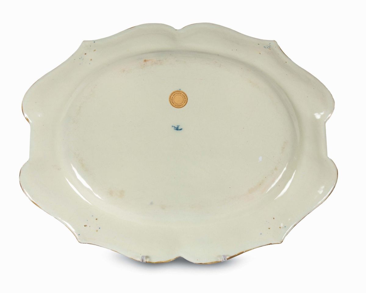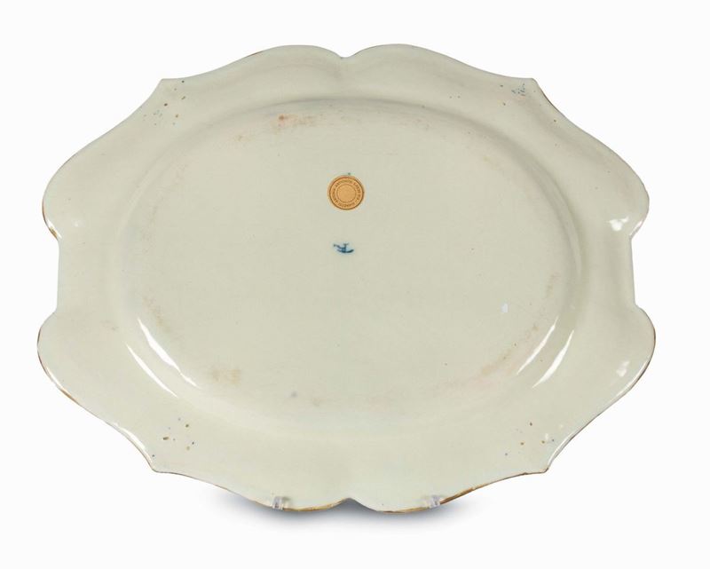Maiolica a gran fuoco in policromia, dimensioni cm 40,5x34,0Buono statoCorpo ovale dal bordo mistilineo, tesa lievemente rialzata, fondo piano. Forma tipica del periodo rococò.Nel cavetto un esuberante composizione floreale, a pieno campo, derivante dalle porcellane orientali di moda verso la meta del '700. Lungo la tesa festoni di fiori e foglie disposti simmetricamente. Al verso la marca TR, per Torino Rossetti.