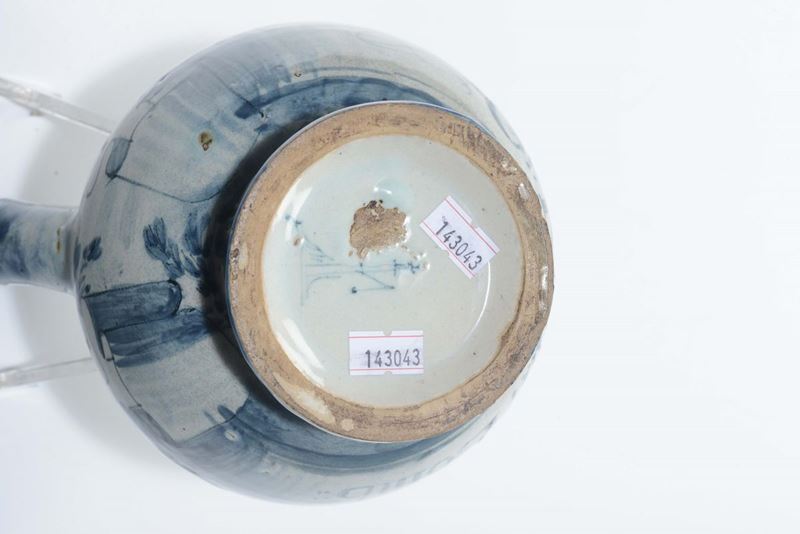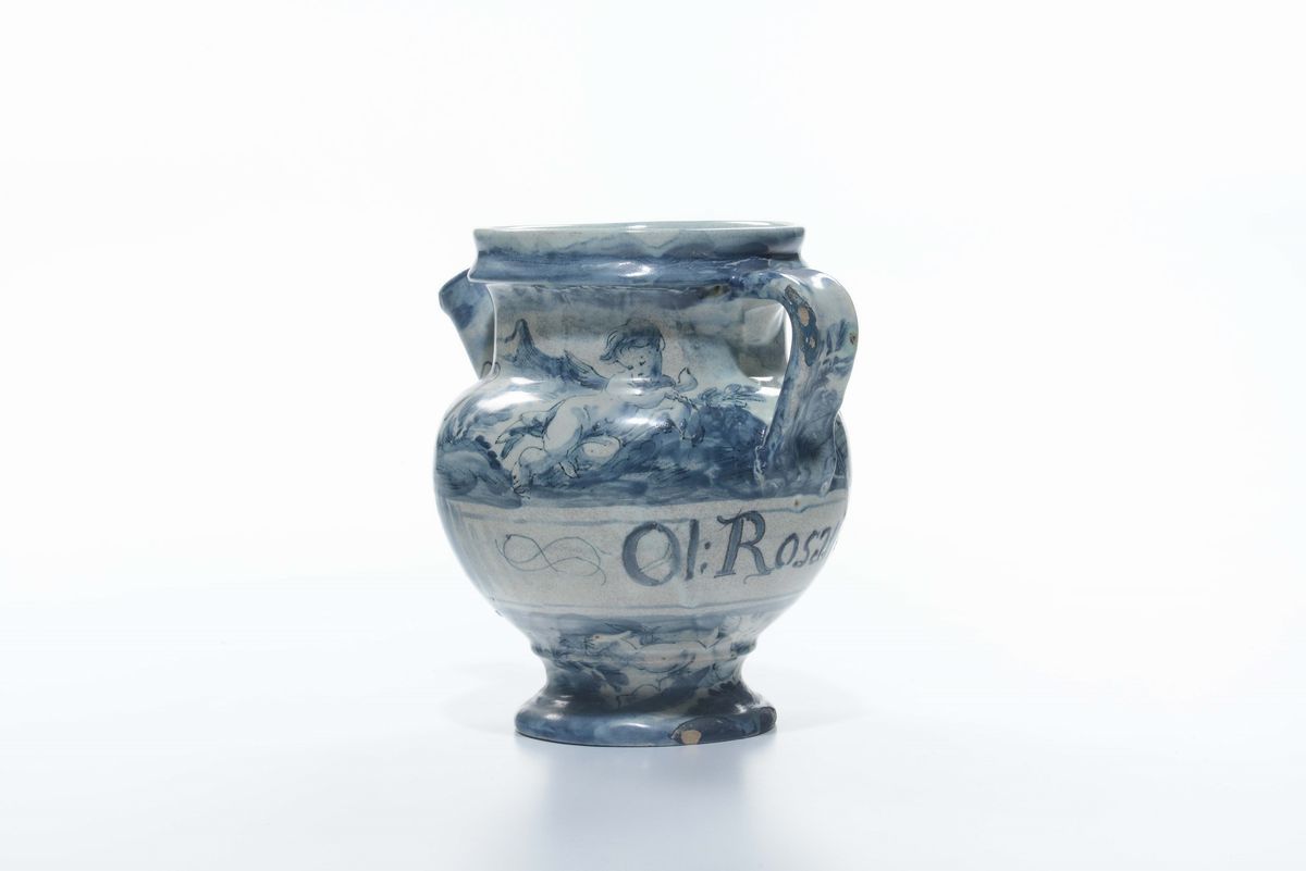 Boccale in maiolica di farmacia con decoro a scenografia barocca, Savona XVIII secolo
